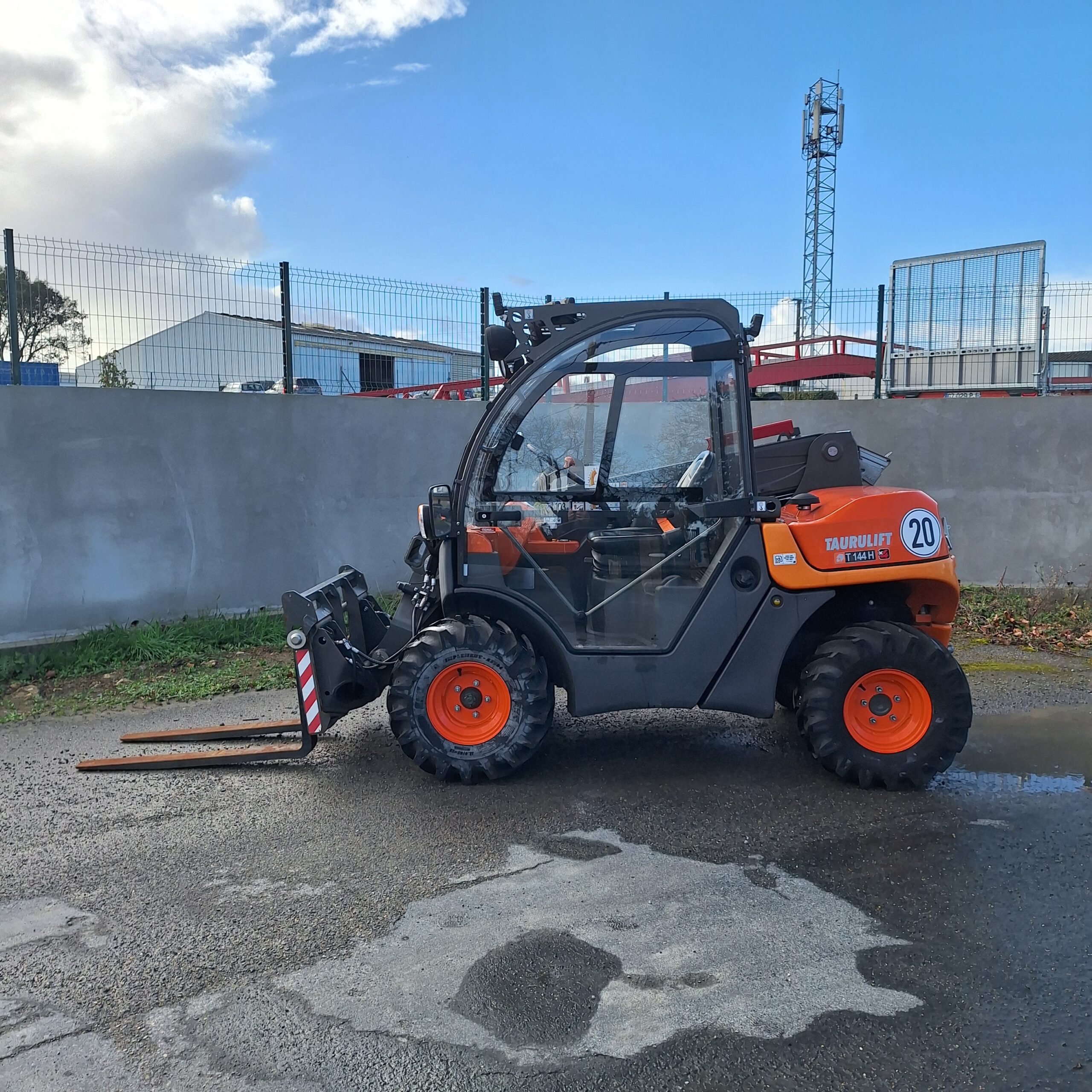 Equipements : Fourches à palette, godet vrac, attache hydraulique, cabine fermée